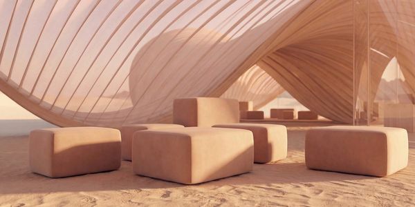 Its translucent skin transforms the desert environment into a soft, atmospheric interior, hosting informal talks, performances, and moments of collective pause.