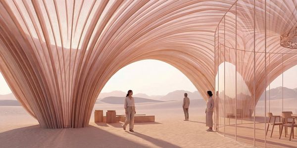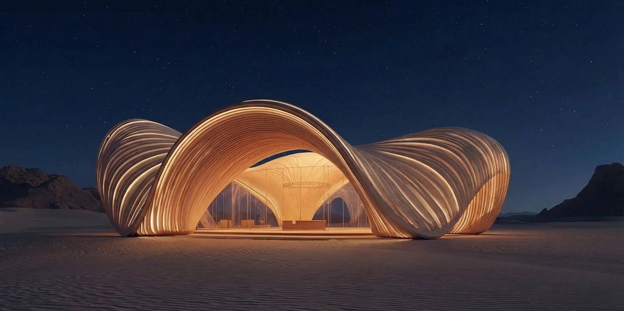 The pavilion’s curved geometry guides movement and perception, creating a continuous spatial flow shaped by the desert landscape.