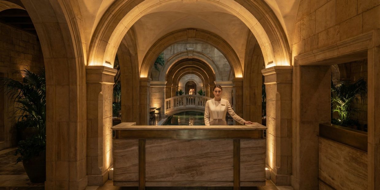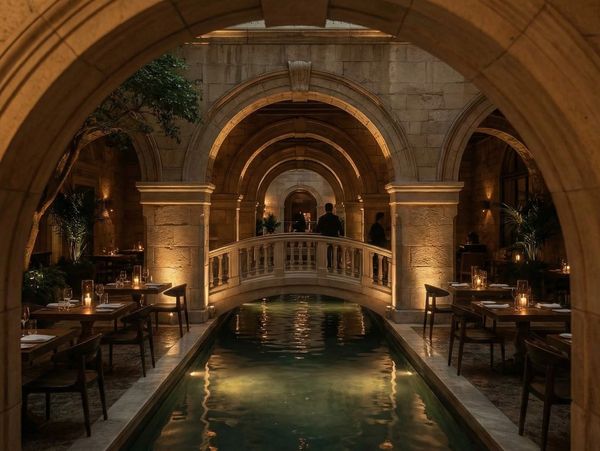 The transitional interior zone defining spatial depth and sequence. Repeating arches, stone surfaces, and controlled lighting guide the guest from the exterior canal space into the inner dining environment.