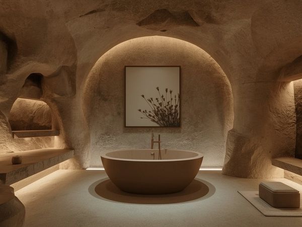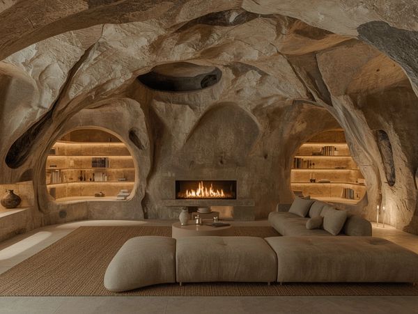 Drawing from cave interiors and primitive hearth rooms, the space is shaped around fire, stone, and enclosure as timeless conditions of rest and presence.