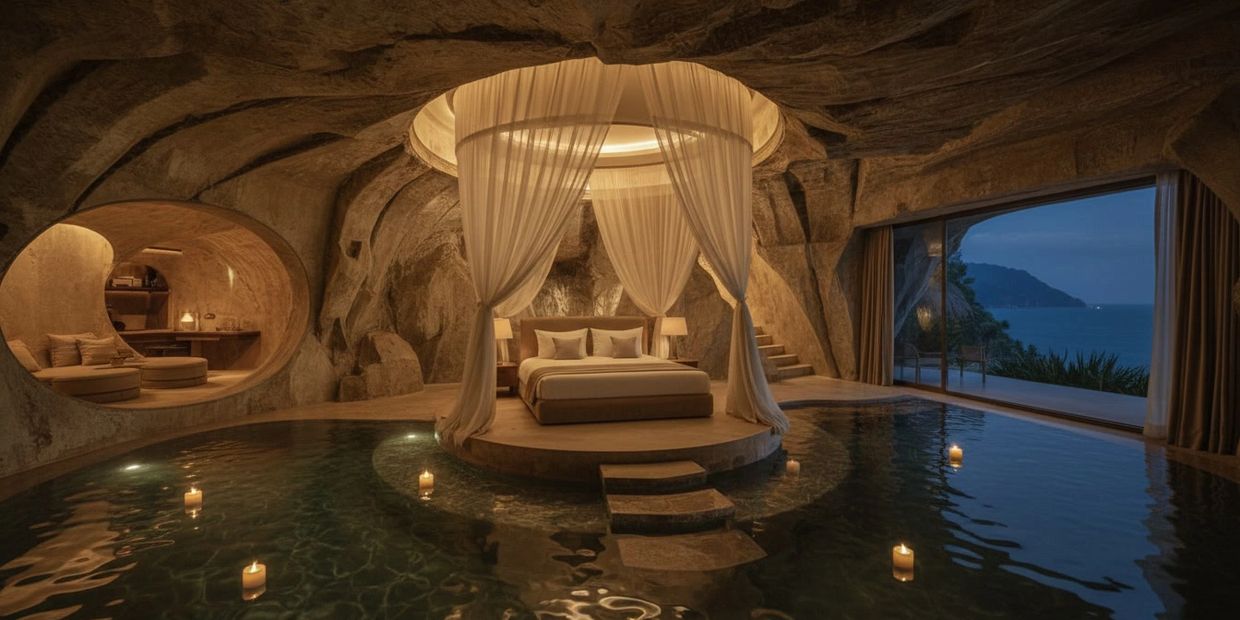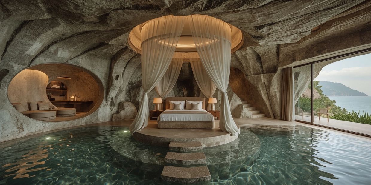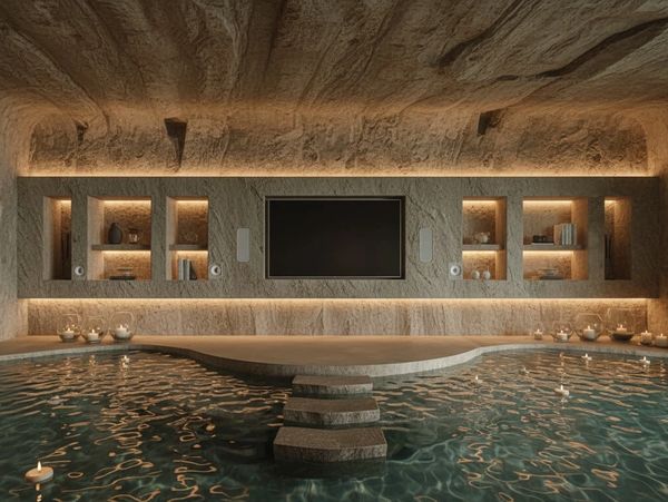 A cinematic cave-inspired suite featuring a sculpted stone media wall, ambient lighting, and integrated water elements, creating a deeply immersive hospitality experience.