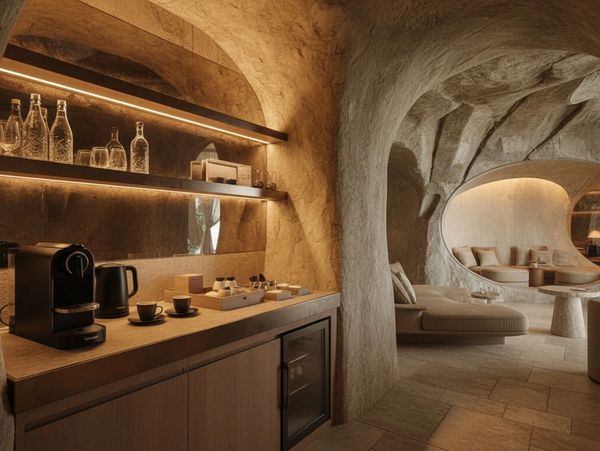 A compact minibar integrated into the stone interior, drawing from cave-like spatial traditions and material continuity.