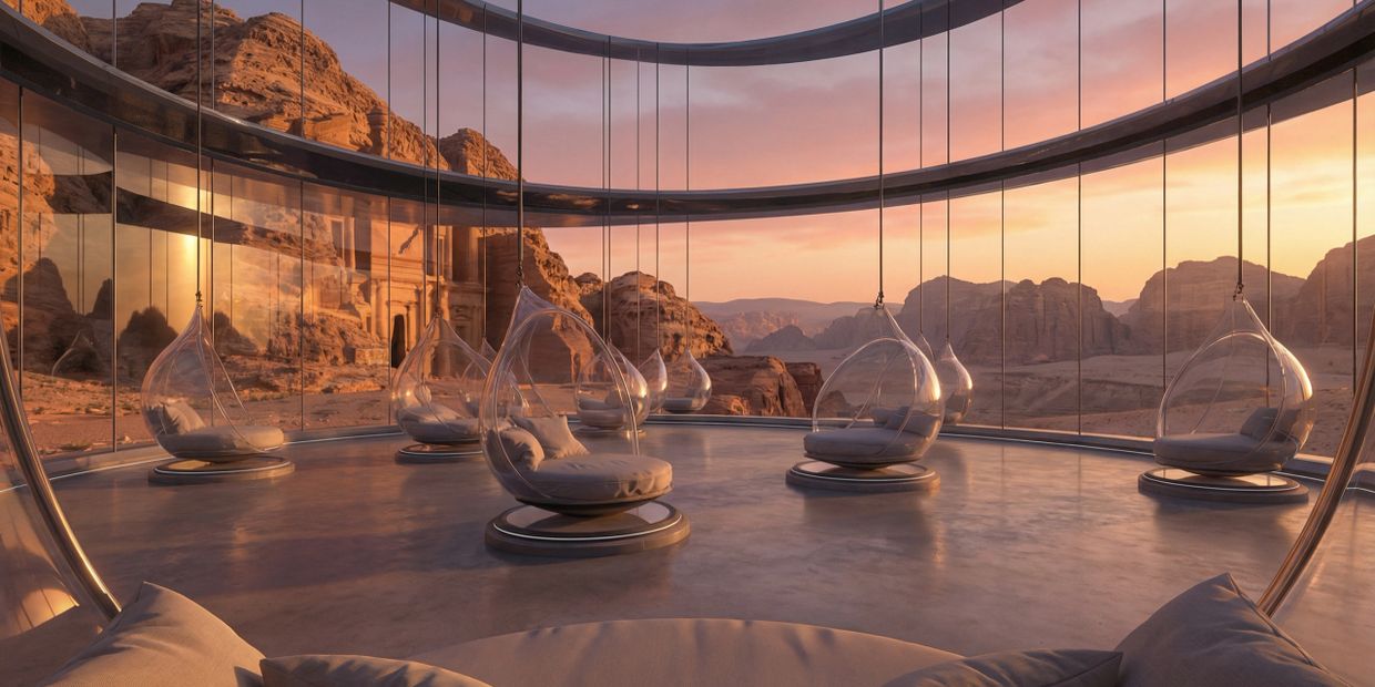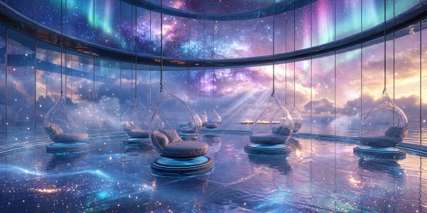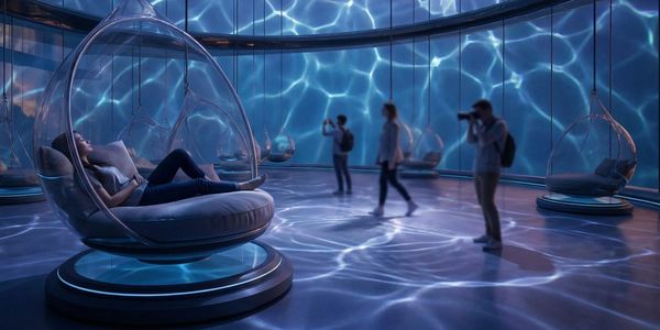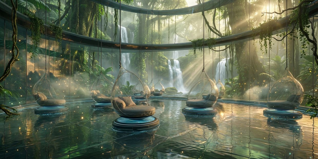 The space is designed for both movement and rest, combining free circulation with suspended relaxation capsules for individual or shared use.